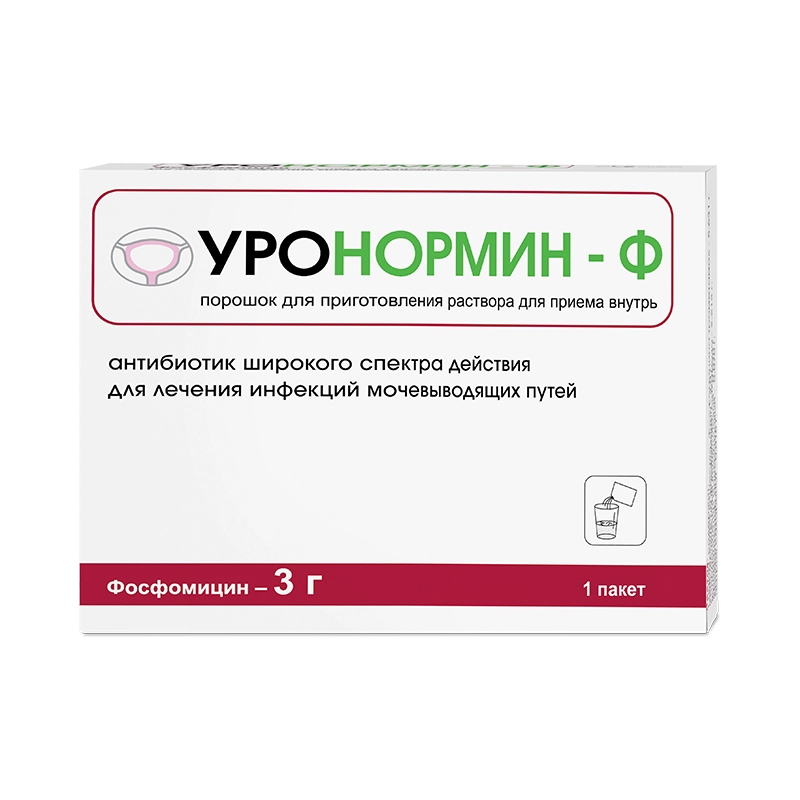УРОНОРМИН-Ф содержит фосфомицин [моно (2-аммоний-2-гидроксиметил-1,3- пропандиол)(2R-цис)-(3-метилоксиранил) фосфонат] - антибактериальное средство широкого спектра действия, производное фосфоновой кислоты, предназначенное для лечения инфекций мочевыводящих путей.