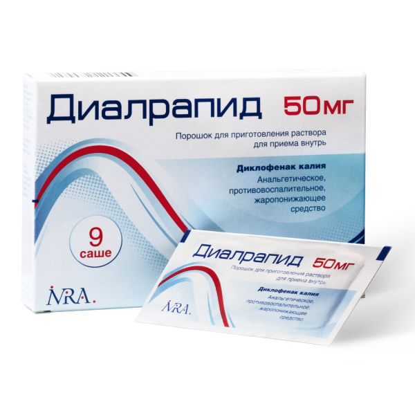 Фармакодинамика Препарат Диалрапид содержит диклофенак калия, вещество нестероидной структуры, оказывающее выраженное анальгезирующее, противовоспалительное и жаропонижающее действие. Благодаря быстрому началу действия, применение калиевой соли диклофенака предпочтительно для лечения острых болевых и воспалительных состояний. Основным механизмом действия диклофенака, установленным в исследованиях, считается торможение синтеза простагландинов, которые играют важную роль в патогенезе воспаления, боли и лихорадки. In vitro диклофенак калия в концентрациях, эквивалентным тем, которые достигаются при применении у человека, не подавляет биосинтез протеогликанов хрящевой ткани. Диклофенак оказывает выраженное анальгезирующее действие при умеренном и выраженном болевом синдроме. При посттравматических и послеоперационных воспалительных явлениях диклофенак быстро купирует боль (как в покое, так и при движении), уменьшает воспалительный отек и отек послеоперационной раны. В клинических исследованиях было установлено, что диклофенак калия способен уменьшать болевые ощущения и снижать кровопотерю при первичной дисменорее. При приступах мигрени Диалрапид уменьшает выраженность головной боли и таких сопутствующих симптомов как тошнота и рвота. Фармакокинетика Всасывание Диклофенак быстро и полностью всасывается. После однократного приема препарата внутрь в дозе 50 мг, максимальная концентрация (Сmax) диклофенака калия в плазме крови достигается через 5-20 минут и составляет в среднем 5,5 мкмоль/л для порошка для приготовления раствора для приема внутрь. При приеме препарата во время еды количество всасывающегося диклофенака не изменяется, хотя начало и скорость всасывания могут несколько замедляться. Абсорбция диклофенака линейно зависит от дозы препарата. Около половины дозы диклофенака метаболизируется во время первого прохождения через печень (эффект «первого прохождения»), площадь под фармакокинетической кривой «концентрация - время» (AUC) после применения внутрь или ректально составляет примерно половину от эквивалентной дозы, применяемой парентерально. После многократного применения препарата Диалрапид показатели фармакокинетики не изменяются. При соблюдении рекомендуемого режима дозирования препарата кумуляции не отмечается. Распределение Связь с белками сыворотки крови - 99,7%, преимущественно с альбумином (99,4 %). Кажущийся объем распределения составляет 0,12-0,17 л/кг. Диклофенак проникает в синовиальную жидкость, где его максимальная концентрация достигается на 2-4 часа позже, чем в плазме крови. Кажущийся период полувыведения из синовиальной жидкости составляет 3-6 часов. Через 2 часа после достижения максимальной концентрации в плазме крови концентрация диклофенака в синовиальной жидкости выше, чем в плазме крови, и ее значения остаются более высокими на протяжении периода времени до 12 часов. Биотрансформация/Метаболизм Метаболизм диклофенака осуществляется частично путем глюкуронирования неизмененной молекулы, но преимущественно посредством однократного и многократного гидроксилирования и метоксилирования, что приводит к образованию нескольких фенольных метаболитов (З’-гидрокси-, 4’-гидрокси-, 5’-гидрокси-, 4’,5-дигидрокси- и 3’-гидрокси-4’-метоксидиклофенака), большинство из которых превращ